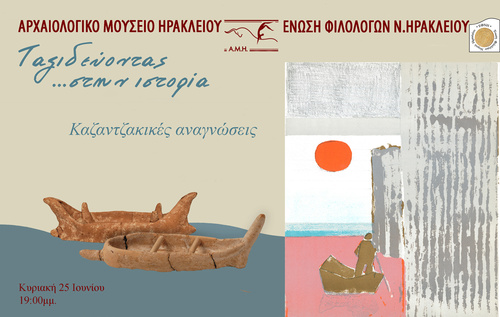 Συνεχίζοντας στον ίδιο νοηματικό άξονα των θεματικών ξεναγήσεων που προηγήθηκαν με τίτλο "ταξιδεύοντας ... στην ιστορία" και με αφορμή το έτος Καζαντζάκη, οργανώνεται, σε συνεργασία με την Ένωση Φιλολόγων Ν. Ηρακλείου (Ε.Φ.Ν.Η.), εσπερίδα με αναγνώσεις αποσπασμάτων του μεγάλου κρητικού συγγραφέα από την "Οδύσσεια" και τη σειρά των έργων "Ταξιδεύοντας".