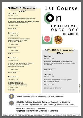 Στην Οφθαλμολογική Κλινική του ΠΑΓΝΗ λειτουργεί τα τελευταία χρόνια τμήμα οφθαλμικής ογκολογίας όπου πραγματοποιείται βραχυθεραπεία οφθαλμικών όγκων με επεμβάσεις τοποθέτησης ραδιενεργών πλακών ρουθενίου 106. Πρόκειται για μια πρωτοποριακή τεχνική που δεν εφαρμόζεται σε κανένα άλλο δημόσιο ελληνικό νοσοκομείο και έτσι η Οφθαλμολογική Κλινική ΠΑΓΝΗ δέχεται παραπομπές περιστατικών από όλο τον ελλαδικό χώρο. Πολλοί ασθενείς με οφθαλμικούς όγκους που μέχρι πριν από μερικά χρόνια έπρεπε να μεταβούν στο εξωτερικό για θεραπεία τώρα θεραπεύονται στην Κρήτη με σημαντικό οικονομικό και κοινωνικό όφελος. Στα πλαίσια της δραστηριότητας αυτής η Οφθαλμολογική Κλινική ΠΑΓΝΗ οργανώνει στο κτήριο της Ιατρικής Σχολής του Πανεπιστημίου Κρήτης διήμερο σεμινάριο οφθαλμικής ογκολογίας με προσκεκλημένο τον διακεκριμένο καθηγητή Οφθαλμολογίας του Πανεπιστημίου της Λωζάνης κ. Λεωνίδα Ζωγράφο, στις 3 & 4 Νοεμβρίου 2017. Το σεμινάριο αυτό είναι ανοικτό στο επιστημονικό κοινό και πραγματοποιείται υπό την αιγίδα του Πανεπιστημίου Κρήτης.