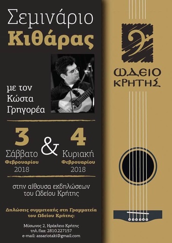 Το Ωδείο Κρήτης του Σεμιναρίου κιθάρας από τον διαπρεπή σολίστα, συνθέτη και καθηγητή κ.Κώστα Γρηγορέα . Το σεμινάριο θα διεξαχθεί στις 3 και 4 Φεβρουαρίου στην αίθουσα εκδηλώσεων του ωδείου και απευθύνεται σε μαθητές κιθάρας όλων των επιπέδων.