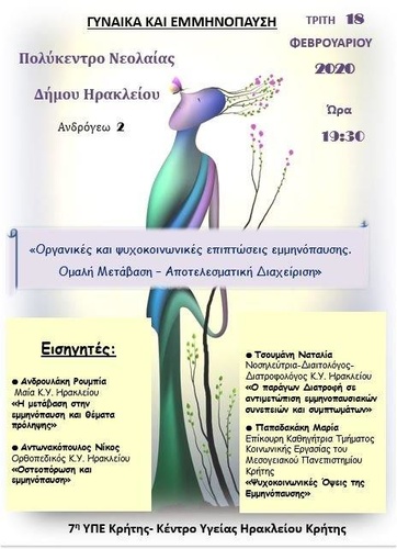 Το Τμήμα μαιών και το (πιλοτικό) διαιτολογικό γραφείο του Κ.Υ. Ηρακλείου σε συνεργασία με την 7η Υ.ΠΕ Κρήτης και το Μεσογειακό Πανεπιστήμιο Κρήτης διοργανώνουν εκδήλωση, με θέμα: «ΓΥΝΑΙΚΑ ΚΑΙ ΕΜΜΗΝΟΠΑΥΣΗ: Οργανικές και ψυχοκοινωνικές επιπτώσεις εμμηνόπαυσης. Ομαλή μετάβαση – αποτελεσματική διαχείριση».