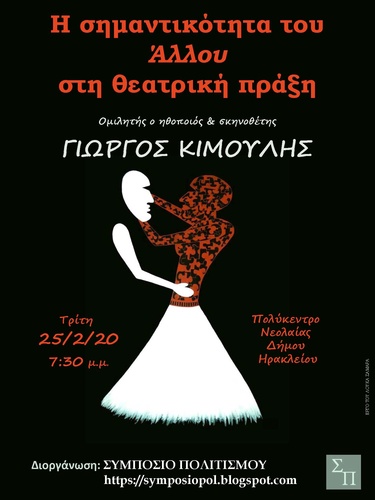 Το «Συμπόσιο Πολιτισμού» πραγματοποιεί μία σημαντική εκδήλωση με ομιλητή τον καταξιωμένο διεθνώς ηθοποιό και σκηνοθέτη, Γιώργο Κιμούλη, με θέμα: «Η σημαντικότητα του ΄Αλλου στη θεατρική πράξη», στο Πολύκεντρο Νεολαίας του Δήμου Ηρακλείου, στις 7:30 το βράδυ, ημέρα Τρίτη 25 Φεβρουαρίου.