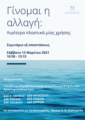 Η Διεύθυνση Δευτεροβάθμιας Εκπαίδευσης Ηρακλείου, μέσω της Υπεύθυνης Σχολικών Δραστηριοτήτων Αγγελικής Ζαχαράτου, και οι ΔΔΕ Λασιθίου, Χανίων, Πειραιά, Α’ Αθήνας και Σερρών, μέσω των Υπευθύνων Περιβαλλοντικής Εκπαίδευσης και Σχολικών Δραστηριοτήτων, σε συνεργασία με το Κοινωφελές Ίδρυμα Αθανασίου Κ. Λασκαρίδη διοργανώνουν «Διαδικτυακό εκπαιδευτικό σεμινάριο με θέμα: Γίνομαι η αλλαγή: Λιγότερα πλαστικά μίας χρήσης», το Σάββατο 13 Μαρτίου 2021 και ώρα 10:30-13:15. Στο συγκεκριμένο σεμινάριο θα γίνει μια συνοπτική παρουσίαση των δράσεων του Κοινωφελούς Ιδρύματος σχετικά με την μείωση της ρύπανσης από πλαστικό και θα παρουσιαστεί το εκπαιδευτικό πρόγραμμα «Συμμετέχω στην αλλαγή» (Για τη Δευτεροβάθμια Εκπαίδευση).