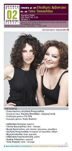Συναυλία με την ΕΛΕΥΘΕΡΙΑ ΑΡΒΑΝΙΤΑΚΗ και την ΤΑΝΙΑ ΤΣΑΝΑΚΛΙΔΟΥ τη ΔΕΥΤΕΡΑ 2 ΑΥΓΟΥΣΤΟΥ 2010 στις 21:30 στο ΠΑΓΚΡΗΤΙΟ ΣΤΑΔΙΟ.