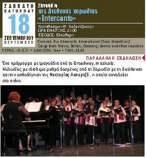 Συναυλία της Διεθνούς χορωδίας «INTERCANTO». Ένα πρόγραμμα με τραγούδια  από το Broadway ,musicals. Μελωδίες με ιδιαίτερο ρυθμό δοσμένες από τη Χορωδία με τη διεύθυνση και την καθοδήγηση της Νεκταρίας Λαουμτζή , η οποία συνοδεύει στο πιάνο το ΣΑΒΒΑΤΟ 18 ΣΕΠΤΕΜΒΡΙΟΥ 2010 στις 21:00 στο Κηποθέατρο «Ν. Καζαντζάκης» με Ελεύθερη είσοδο.