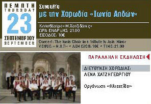 Συναυλία με την Χορωδία «ΙΩΝΙΑ ΑΗΔΩΝ». Διεύθυνση Χορωδίας: Λένα Χατζηγεωργίου την ΠΕΜΠΤΗ 23 ΣΕΠΤΕΜΒΡΙΟΥ 2010 στις 21:00 στο Κηποθέατρο «Μ.Χατζιδάκις». Οργάνωση ο Παγκρήτιος Σύλλογος Γονέων και Φίλων παιδιών με Νεοπλασία «Ηλιαχτίδα»