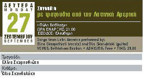 Συναυλία με τραγούδια από την Λατινική Αμερική τη ΔΕΥΤΕΡΑ 27 ΣΕΠΤΕΜΒΡΙΟΥ 2010 στις 21:00 στην «Πύλη Βηθλεέμ» με Ελεύθερη είσοδο.