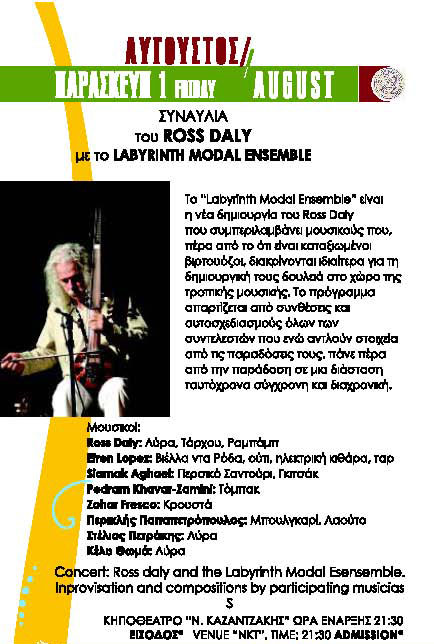 ΣΥΝΑΥΛΙΑ ΤΟΥ ROSS DAILY ΜΕ ΤΟ LABYRINTH MODAL ENSEMBLE (Μουσικοί από Ισπανία ,Ελλάδα ,Περσία και Ισραήλ) με αυτοσχεδιασμούς και συνθέσεις των ιδίων των συντελεστών που κινούνται σε σύγχρονα τροπικά (modal) μοτίβα.