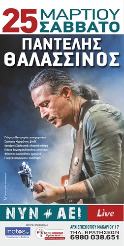 Το Σάββατο 25 Μαρτίου ο Παντελής Θαλασσινός μαζί με 6 φίλους του, τους: Γιώργο Βεντουρή κοντραμπάσο, Σωτήρη Μαργώνη: βιολί, Λευτέρη Χαβουτσά: κλασική κιθάρα, Πάνο Δημητρακόπουλο: κανονάκι, Φίλιππο Λευκαδίτη: κρουστά, και ηχολήπτη το Γιώργο Καρυώτη, θα παρουσιάσει, με διάθεση ακουστική, και χαμηλές εντάσεις, τραγούδια απ το γνωστό και άγνωστο ρεπερτόριό του, καθώς και τραγούδια απ’ τις δυο τελευταίες του δουλειές με τίτλο: "Να ΄ταν ο Πόλεμος χορός" και "Με δυο ρολόγια"