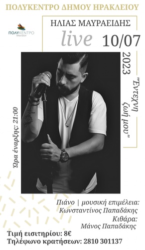 O Ηρακλειώτης καλλιτέχνης με την ιδιαίτερη και ζεστή φωνή του θα μας ερμηνεύσει ένα όμορφο έντεχνο πρόγραμμα γεμάτο αγαπημένα και διαχρονικά τραγούδια.