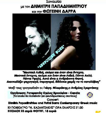 Συναυλία με τον ΔΗΜΗΤΡΗ ΠΑΠΑΔΗΜΗΤΡΙΟΥ και την ΦΩΤΕΙΝΗ ΔΑΡΡΑ την Τετάρτη 5 Αυγούστου στις 21:30 στο Κηποθέατρο «Ν. ΚΑΖΑΝΤΖΑΚΗΣ».