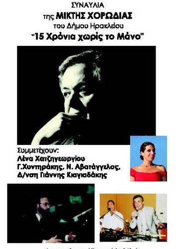 «15 Χρόνια  χωρίς  το Μάνο». Συναυλία  με τη  Μικτή  Χορωδία του  Δήμου  Ηρακλείου, συμμετέχουν:  Λ. Χατζηγεωργίου, Γ.Χυντηράκης, Ν. Αβατάγγελος , Δ/νση  Γ. Κιαγιδάκης τη Δευτέρα 31 Αυγούστου στις 21:30 στη Χαμηλή  Πλατεία ΠΥΛΗΣ  ΒΗΘΛΕΕΜ, (Δημοτικός  Κινηματογράφος). Είσοδος  Ελεύθερη