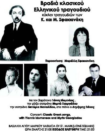 Βραδιά Κλασικού Ελληνικού τραγουδιού - κύκλοι τραγουδιών Κ. και Μ. Σφακιανάκη με τον Γιάννη Ιδομενέως , Μυρτώ Γεωργιάδου και Βικτώρια Μανωλίδου. Στο πιάνο ο Δημήτρης Γιάκας. Παρουσίαση:Μαριέλλη Σφακιανάκη στη «Βασιλική Αγ. Μάρκου» την Τετάρτη 2 Σεπτεμβρίου στις 21:00. Είσοδος Ελεύθερη