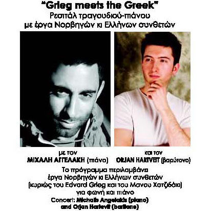 Ρεσιτάλ τραγουδιού - πιάνου με τον ΜΙΧΑΛΗ ΑΓΓΕΛΑΚΗ (πιάνο) και τον ORJAN HARTVEIT (βαρύτονο) την Τρίτη 15 Σεπτεμβρίου στις 21:00 στη «Βασιλική Αγ.Μάρκου». Είσοδος ελεύθερη.