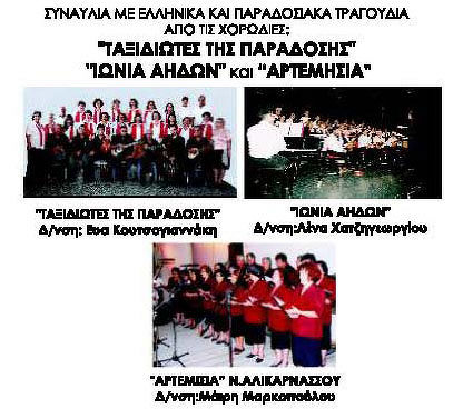 ΠΑΡΑΔΟΣΙΑΚΑ ΚΑΙ ΣΥΓΧΡΟΝΑ ΕΛΛΗΝΙΚΑ ΤΡΑΓΟΥΔΙΑ με τις Χορωδίες «ΙΩΝΙΑ ΑΗΔΩΝ» ,«ΤΑΞΙΔΙΩΤΕΣ ΤΗΣ ΠΑΡΑΔΟΣΗΣ» και «ΑΡΤΕΜΗΣΙΑ» Ν. ΑΛΙΚΑΡΝΑΣΣΟΥ την Παρασκευή 18 Σεπτεμβρίου στις 21:00 στο Κηποθέατρο «Ν. ΚΑΖΑΝΤΖΑΚΗΣ» Είσοδος Ελεύθερη