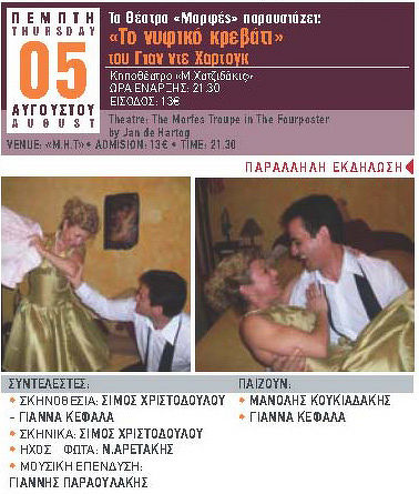 Το «Θέατρο Μορφές» παρουσιάζει την κωμωδία του Γιαν ντε Χαρτογκ «ΤΟ ΝΥΦΙΚΟ ΚΡΕΒΑΤΙ» σε σκηνοθεσία Σίμου Χριστοδούλου – Γιάννας Κεφάλα την ΠΕΜΠΤΗ 5 ΑΥΓΟΥΣΤΟΥ 2010 στις 21:30 στο Κηποθέατρο «Μ.Χατζιδάκις».