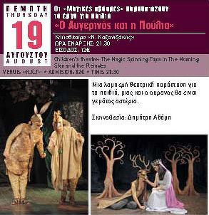 Οι «Μαγικές σβούρες» παρουσιάζουν το έργο για παιδιά «Ο ΑΥΓΕΡΙΝΟΣ ΚΑΙ Η ΠΟΥΛΙΑ» σε σκηνοθεσία Δημήτρη Αδάμη την ΠΕΜΠΤΗ 19 ΑΥΓΟΥΣΤΟΥ 2010 στις 21:30 στο Κηποθέατρο «Ν. Καζαντζάκης».