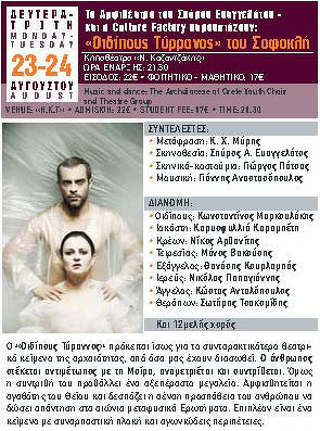 Το «Αμφιθέατρο» του Σπύρου Ευαγγελάτου παρουσιάζει η τραγωδία του Σοφοκλή «ΟΙΔΙΠΟΥΣ ΤΥΡΡΑΝΟΣ» σε σκηνοθεσία Σπύρου Ευαγγελάτου τη ΔΕΥΤΕΡΑ 23 και τη ΤΡΙΤΗ 24 ΑΥΓΟΥΣΤΟΥ 2010 στις 21:30 στο Κηποθέατρο «Ν. Καζαντζάκης».