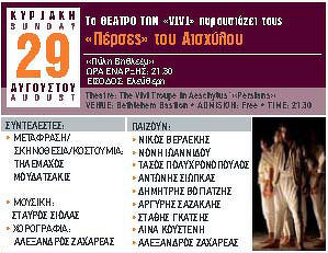 Το ΘΕΑΤΡΟ ΤΩΝ «VIVI» παρουσιάζει το έργο «ΠΕΡΣΕΣ» του Αισχύλου σε σκηνοθεσία Τηλέμαχου Μουδατσάκι την ΚΥΡΙΑΚΗ 29 ΑΥΓΟΥΣΤΟΥ 2010 στις 21:30 στο Κηποθέατρο «Μ.Χατζιδάκις» με ελεύθερη είσοδο.