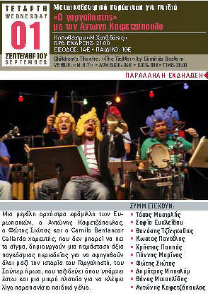 Μουσικοθεατρική παράσταση για παιδιά «Ο ΓΑΡΓΑΛΗΣΤΗΣ» του Δημήτρη Μπασλάμ με τον Αντώνη Καφετζόπουλο την ΤΕΤΑΡΤΗ 1 ΣΕΠΤΕΜΒΡΙΟΥ 2010 στις 21:00 στο Κηποθέατρο Μ.Χατζιδάκις.