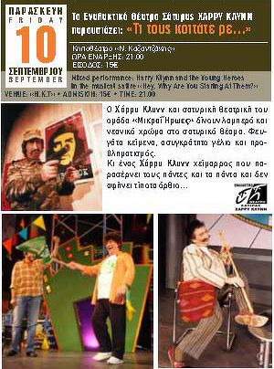 Σατυρική μουσική παράσταση «ΤΙ ΤΟΥΣ ΚΟΙΤΑΤΕ ΡΕ…» με τον Χάρρυ Κλύνν. Συμμετέχει η σατυρική θεατρική ομάδα «Μικροί Ήρωες» στο Κηποθέατρο «Ν. Καζαντζάκης» την ΠΑΡΑΣΚΕΥΗ 10 ΣΕΠΤΕΜΒΡΙΟΥ 2010 στις 21:00.