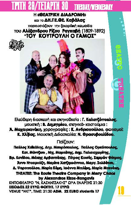 ΘΕΑΤΡΙΚΗ ΔΙΑΔΡΟΜΗ «ΤΟΥ ΚΟΥΤΡΟΥΛΗ Ο ΓΑΜΟΣ» του Αλέξανδρου Ρίζου-Ραγκαβή Σκηνοθεσία: Γιάννη Καλατζόπουλου Παίζουν: Παύλος Χαϊκάλης, Δημήτρης Μαυρόπουλος.