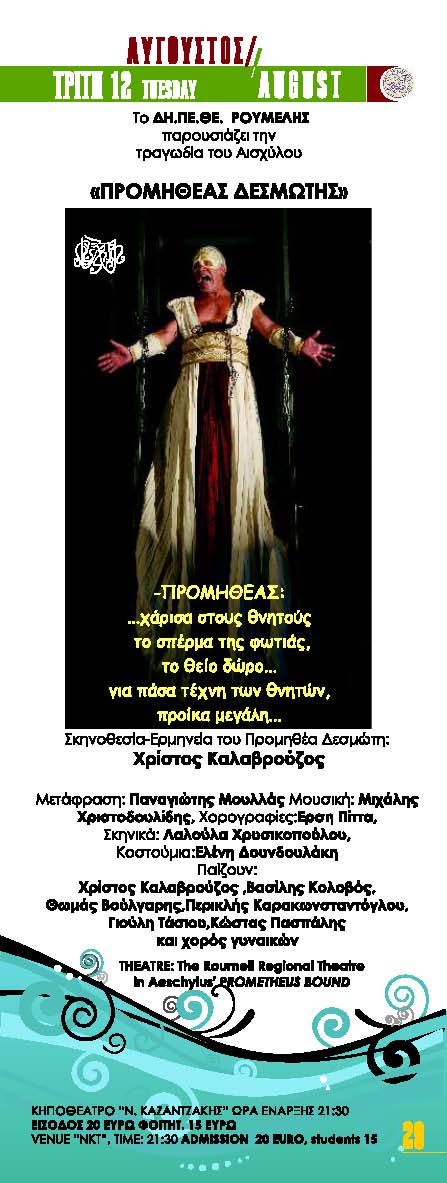 ΘΕΑΤΡΙΚΗ ΠΑΡΑΣΤΑΣΗ «ΠΡΟΜΗΘΕΑΣ ΔΕΣΜΩΤΗΣ» του Αισχύλου από το ΔΗ.ΠΕ.ΘΕ. ΡΟΥΜΕΛΗΣ Σκηνοθεσία:Χρήστος Καλαβρούζος .Παίζουν: Χρίστος Καλαβρούζος ,Βασίλης Κολοβός, Θωμάς Βούλγαρης κ.α.