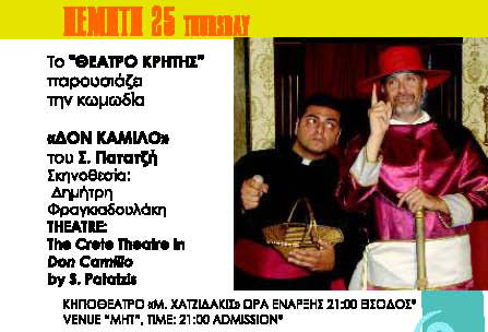 Το ΘΕΑΤΡΟ ΚΡΗΤΗΣ παρουσιάζει την κωμωδία «ΔΟΝ ΚΑΜΙΛΟ» ΤΟΥ Σ. Πατατζή .Σκηνοθεσία: Δημήτρη Φραγκιαδουλάκη.