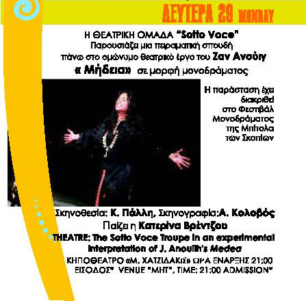 Η ΘΕΑΤΡΙΚΗ ΟΜΑΔΑ "Sotto Voce" Παρουσιάζει μια πειραματική σπουδή πάνω στο ομώνυμο θεατρικό έργο του Ζαν Ανούιγ « Μήδεια» σε μορφή μονοδράματος σκηνοθεσία: