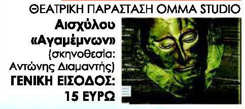 ΘΕΑΤΡΙΚΗ ΠΑΡΑΣΤΑΣΗ OMMA STUDIO Αισχύλου'ΑΓΑΜΕΜΝΩΝ"(σκηνοθεσία:Αντώνης Διαμαντής) ΓΕΝΙΚΗ ΕΙΣΟΔΟ:15 EYRO.Κυριακή 10 Αυγούστου στις 21:00.