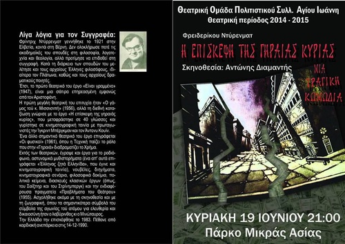Η 4ο Δημοτική Κοινότητα του Δήμου Ηρακλείου σε συνεργασία με τη Θεατρική Ομάδα του Πολιτιστικού Συλλόγου Αγ. Ιωάννη παρουσιάζει το Θεατρικό έργο του Φρειδερίκου Ντύρενματ «Η επίσκεψη της γηραιάς κυρίας» σε σκηνοθεσία Αντώνη Διαμαντή. Η παράσταση θα δοθεί στην πλατεία Νικαίας την Τρίτη 21 Ιουλίου στις 21:00 και η είσοδος είναι ελεύθερη για το κοινό.