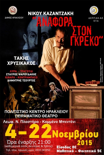 Ο Δήμος Ηρακλείου και η ΔΗ.Κ.Ε.Η. σε συνεργασία με τον Τάκη Χρυσικάκο, παρουσιάζουν την θεατρική παράσταση «ΑΝΑΦΟΡΑ ΣΤΟΝ ΓΚΡΕΚΟ» του Νίκου Καζαντζάκη, στο Πειραματικό Θέατρο του Πολιτιστικού Κέντρου Ηρακλείου (Λ. Πλαστήρα – Κομμένο Μπεντένι), από την Τετάρτη 4 έως την Κυριακή 22 Νοεμβρίου καθημερινά εκτός Δευτέρας & Τρίτης.
