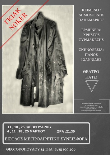 Το Διαρτηρητέο παρουσιάζει την παράσταση «ΝΟΚΕR» από τη συλλογή διηγημάτων «ΓΚΙΑΚ» του Δημοσθένη Παπαμάρκου στο θέατρο «ΚΑΤΩ» στην οδό Θεοτοκοπούλου 14. Η είσοδος είναι με προαιρετική συνεισφορά και θα παίζετε 11,18,25 Φεβρουαρίου και 4,11,18 και 25 Μαρτίου κάθε Σάββατο στις 21:30 το βράδυ .