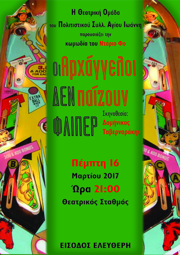 Η θεατρική ομάδα του Π.Σ. Αγίου Ιωάννη, στο πλαίσιο των «ΠΟΛΙΤΙΣΤΙΚΩΝ ΑΓΩΝΩΝ 2017» που οργανώνει ο Δήμος Ηρακλείου και η ΔΗΚΕΗ, παρουσιάζει το έργο του Ντάριο Φο «Οι αρχάγγελοι δεν παίζουν φλίπερ» σε σκηνοθεσία Δομίνικου Ταβερναράκη.