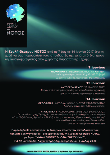 Η Σχολή θεάτρου ΝΟΤΟΣ από τις 7 έως τις 14 Ιουνίου 2017 έχει τη χαρά να σας παρουσιάσει τους σπουδαστές της, μετά από ένα χρόνο δημιουργικής εργασίας στον χώρο της Παραστατικής Τέχνης.