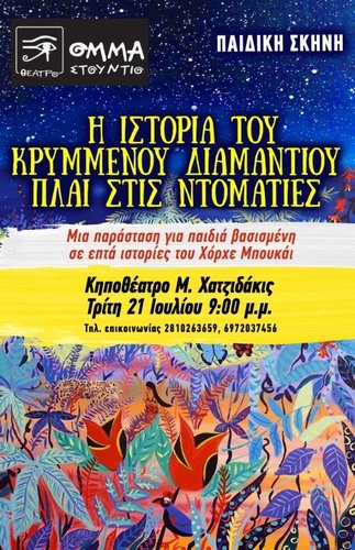 ΟΜΜΑ ΣΤΟΥΝΤΙΟ – ΠΑΙΔΙΚΗ ΣΚΗΝΗ «Η ΙΣΤΟΡΙΑ ΤΟΥ ΚΡΥΜΕΝΟΥ ΔΙΑΜΑΝΤΙΟΥ ΠΛΑΪ ΣΤΙΣ ΝΤΟΜΑΤΙΕΣ» «Οι ιστορίες είναι μόνο ορισμένες πέτρες! Πράσινες πέτρες, κίτρινες πέτρες, κόκκινες πέτρες… Οι ιστορίες γράφονται μόνο για να σημαδέψουν ένα σημείο ή ένα δρόμο. Η δουλειά της ανασκαφής μέσα σε κάθε ιστορία, Για να βρεθεί το διαμάντι που κρύβεται… είναι υπόθεση του καθενός… ΧΟΡΧΕ ΜΠΟΥΚΑΪ Σε μια πολύ μακρινή χώρα ζούσε ένας αγρότης. Ήταν ιδιοκτήτης ενός μικρού κομματιού γης όπου καλλιεργούσε δημητριακά. Μια μέρα ενώ δούλευε στο χωράφι του είδε κάτι που έλαμπε δυνατά. “Πρέπει να είναι διαμάντι, θα έχει τεράστια αξία. Πω, πω, πόσα πράγματα θα μπορούσα να κάνω αν πουλήσω το διαμάντι…. Όμως….Τώρα που το ξανασκέφτομαι…. Αυτή η πέτρα είναι ένα δώρο του ουρανού και οφείλω να την φυλάξω και να την χρησιμοποιήσω μόνο σε περίπτωση ανάγκης”. Πήρε λοιπόν διαμάντι και το έθαψε στον κήπο του σπιτιού, ανάμεσα στις ντοματιές κι έβαλε από πάνω μια κίτρινη πέτρα για να σημαδέψει το σημείο. Ο αγρότης είχε ένα παιδί. Μια μέρα ο αγρότης θέλησε να του μιλήσει για το μεγάλο μυστικό: «Θα σου πω ένα μυστικό. Κάτω από τον σωρό με τις κίτρινες πέτρες είναι θαμμένο ένα διαμάντι, που είναι ο θησαυρός της οικογένειάς μας.… Και για να βρεις το διαμάντι, θα πρέπει να …. «διαβάσεις τις 7 πέτρες»…. Έτσι ξεκινά ένα ταξίδι στα μονοπάτια της καρδιάς, μια περιπέτεια γεμάτη βασιλιάδες, γέρους σοφούς, αστείες και αλληγορικές καταστάσεις….!