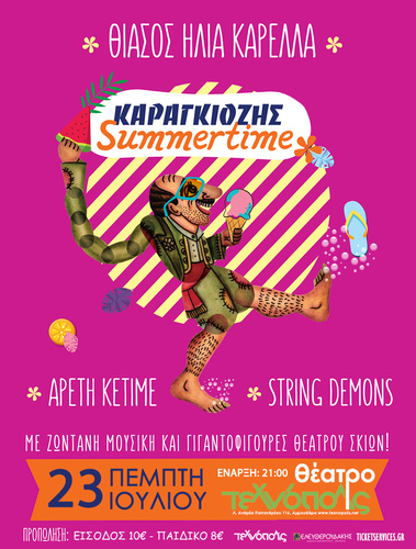 Ο γνωστός σκιοπαίκτης και σκηνοθέτης Ηλίας Καρελλάς, μετά τις sold out παραστάσεις του στο Μέγαρο Μουσικής Αθηνών και στο Θέατρο Κάππα, αντλώντας έμπνευση από τις κλασικές παραστάσεις του Θεάτρου Σκιών και φυσικά την επικαιρότητα, δημιουργεί μια ολοκαίνουργια καλοκαιρινή μουσική κωμωδία με πρωταγωνιστή τον Καραγκιόζη. Μια παράσταση με ζωντανή μουσική, γιγαντοφιγούρες Θεάτρου Σκιών και τις ξεκαρδιστικότερες ατάκες του πιο αγαπημένου ήρωα μικρών και μεγάλων!