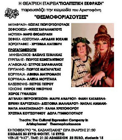 Η ΕΤΑΙΡΕΙΑ «ΠΟΛΙΤΙΣΤΙΚΗ ΕΚΦΡΑΣΗ» παρουσιάζει την θεατρική παράσταση «ΘΕΣΜΟΦΟΡΙΑΖΟΥΣΕΣ» του Αριστοφάνη σε σκηνοθεσία: Νίκου Χαραλάμπους με τους ΒΑΣΙΛΗ ΤΣΙΒΙΛΙΚΑ και ΓΙΩΡΓΟ ΚΩΝΣΤΑΝΤΙΝΟΥ τη Δευτέρα 17 και την Τρίτη 18 Αυγούστου στις 21:30 στο Κηποθέατρο «Ν. ΚΑΖΑΝΤΖΑΚΗΣ».