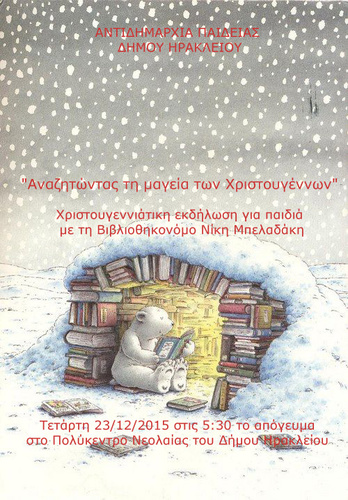 Η βιβλιοθηκονόμος κ. Νίκη Μπελαδάκη μέσα από την ανάγνωση ιστοριών και με δημιουργικές δραστηριότητες θα ταξιδέψει τα παιδιά στο μαγικό κόσμο των Χριστουγέννων.