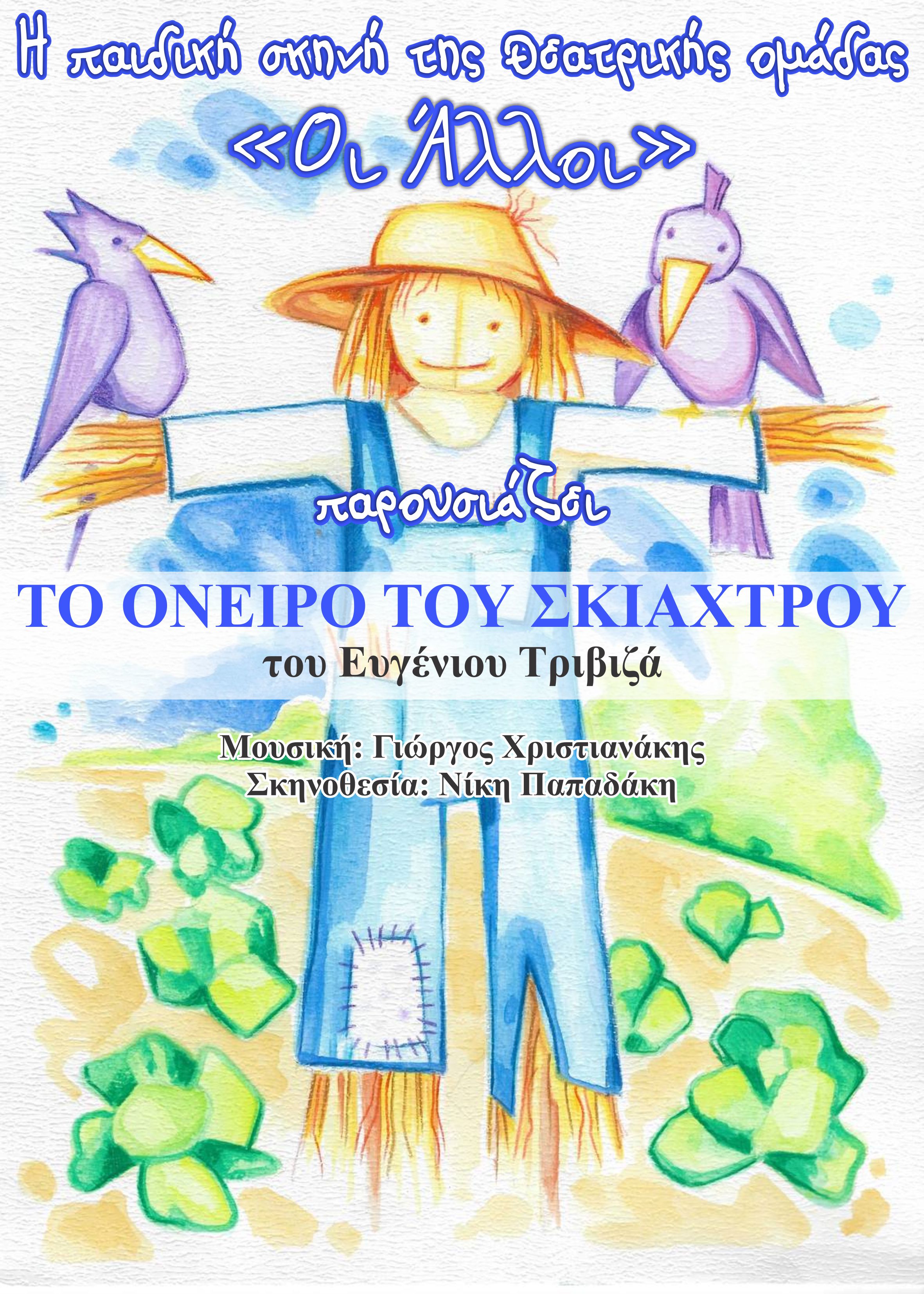Η παιδική σκηνή της θεατρικής ομάδας «ΟΙ ΑΛΛΟΙ» παρουσιάζει το έργο του Ευγένιου Τριβιζά «Το Όνειρο Του Σκιάχτρου» την Δευτέρα 1 Αυγούστου στο Ανοικτό Θέατρο «Πύλη Βηθλεέμ» στις 21:30.