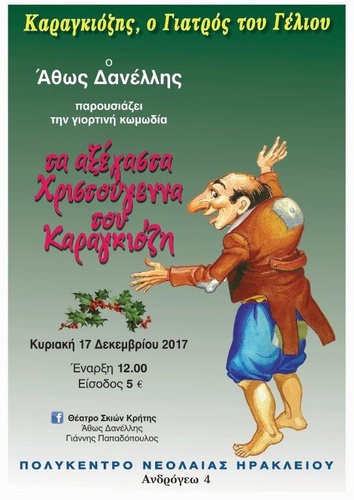 Το Θέατρο Σκιών Κρήτης του Άθου Δανέλλη, σε συνεργασία με το Πολύκεντρο Νεολαίας Δήμου Ηρακλείου, παρουσιάζει την γιορτινή κωμωδία «ΤΑ ΑΞΕΧΑΣΤΑ ΧΡΙΣΤΟΥΓΕΝΝΑ ΤΟΥ ΚΑΡΑΓΚΙΟΖΗ» από το ρεπερτόριο του Ελληνικού Θεάτρου Σκιών στον χώρο της οδού Ανδρόγεω 2 (ισόγειο), Ώρα έναρξης 12:00 με τιμή εισόδου 5€.