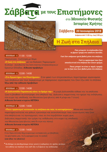 Ελάτε το Σάββατο 20 Ιανουαρίου 2018 στο Μουσείο Φυσικής Ιστορίας Κρήτης του Πανεπιστημίου Κρήτης για να γνωρίσετε έναν επιστήμονα και να συζητήσετε μαζί του για τη Ζωή στα Σπήλαια. Σας περιμένουμε ακόμη για να παίξουμε, να εξερευνήσουμε και να φτιάξουμε κατασκευές!