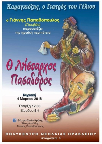 Το Θέατρο Σκιών Κρήτης των Άθω Δανέλλη και Γιάννη Παπαδόπουλου (Γιουβάν), σε συνεργασία με το Πολύκεντρο Νεολαίας Δ. Ηρακλείου, παρουσιάζει επιλεγμένα έργα από το ρεπερτόριο του Ελληνικού Θεάτρου Σκιών στον φιλόξενο χώρο της οδού Ανδρόγεω.