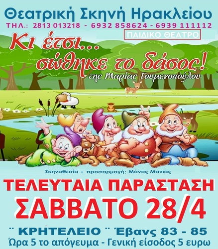 Πρόκειται για ένα έργο βραβευμένο με κρατικό βραβείο και έχει οικολογικό περιεχόμενο.Πέντε νάνοι, κι ένας λαγός με πολύ κέφι ,τραγούδι και χορό θα φέρουν στην επιφάνεια την αξία και χρησιμότητα του δάσους και κατ επέκταση του πράσινου… Έρχεται ένας σουπερνανος από την μεγάλη πολιτεία που θα χαλάσει την ήρεμη ζωή στο δάσος… Το μοτοσακό ,τα αποσμητικά , τα cd και άλλα σύγχρονα μέσα είναι ικανά να ανατρέψουν τα πράγματα; Θα δούμε…. Το σίγουρο είναι ότι θα ξυπνήσει οικολογικές συνειδήσεις και θα παρασύρει τα παιδιά να ψηφίσουν μαζί με τους νάνους τη σωτηρία του δάσους και κατ΄ επέκταση την αγάπη τους για τη φύση.