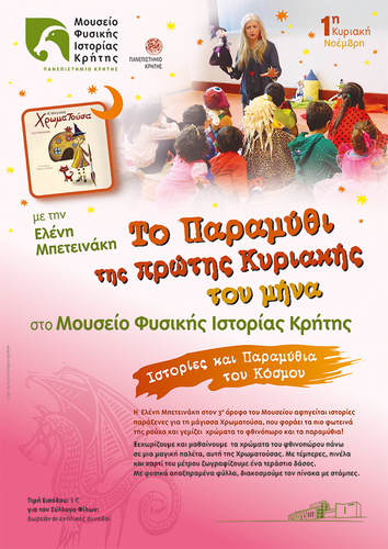 Η Ελένη Μπετεινάκη εγκαινιάζει τη φετινή χρονιά με Ιστορίες και Παραμύθια του Κόσμου στο Μουσείο Φυσικής Ιστορίας Κρήτης. Την Κυριακή 4 Νοεμβρίου 2018 στις 11.00 το πρωί, στον 3 όροφο του Μουσείου αφηγείται ιστορίες παράξενες για τη μάγισσα Χρωματούσα, που φοράει τα πιο φωτεινά της ρούχα και γεμίζει χρώματα το φθινόπωρο και τα παραμύθια!
