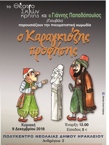 Την Κυριακή 9 Δεκεμβρίου, στο στέκι της οδού Ανδρόγεω, το Θέατρο Σκιών Κρήτης ολοκληρώνει την παρουσίαση της πρώτης τριλογίας κλασικών κωμωδιών του Ελληνικού Θεάτρου Σκιών με το πνευματιστικό έργο «Ο Καραγκιόζης Προφήτης».