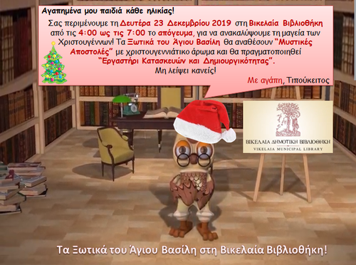 Σας περιμένουμε τη Δευτέρα 23 Δεκεμβρίου 2019 στη βιβλιοθήκη από τις 4:00 έως τις 7:00 το απόγευμα, για να ανακαλύψουμε τη μαγεία των Χριστουγέννων! Τα Ξωτικά του Άη Βασίλη θα αναθέσουν «Μυστικές Αποστολές» με χριστουγεννιάτικο άρωμα και θα πραγματοποιηθεί «Εργαστήρι Κατασκευών και Δημιουργικότητας». Μη λείψει κανείς!