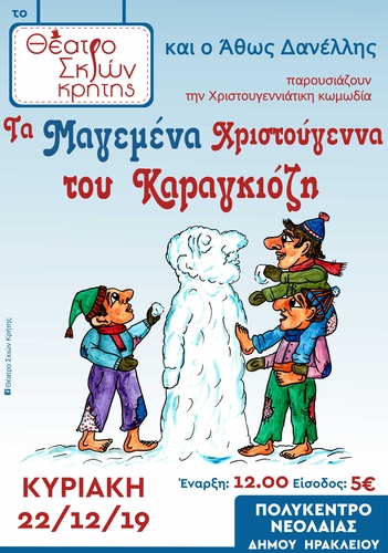“Τα Μαγεμένα Χριστούγεννα του Καραγκιόζη”, μια γιορτινή κωμωδία για μικρούς και μεγάλους στο πνεύμα των ημερών, την ερχόμενη Κυριακή 22 Δεκεμβρίου και ώρα δωδεκάτη μεσημβρινή στο Πολύκεντρο Νεολαίας του Δήμου Ηρακλείου.