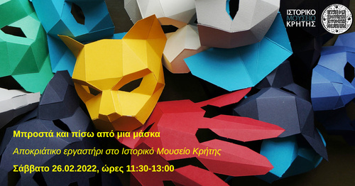 Το Ιστορικό Μουσείο Κρήτης προσκαλεί τα παιδιά σε ένα ταξίδι στον κόσμο της μάσκας, το Σάββατο 26 Φεβρουαρίου 2022, 11:30-13:00. Παρέα θα εξερευνήσουμε την ιστορία της μάσκας από τα προϊστορικά χρόνια ως σήμερα. Μέσα από την τέχνη, τη λογοτεχνία, τη μουσική θα ανακαλύψουμε μάσκες πραγματικές, αλλά και αόρατες, μάσκες που μας απελευθερώνουν και άλλες που μας περιορίζουν. Θα δημιουργήσουμε τη δική μας μάσκα που θα φέρει τα μοναδικά χαρακτηριστικά του καθενός και της καθεμιάς μας.