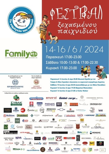 «Το Χαμόγελο του Παιδιού» και το «Παιδικό Ραδιόφωνο Family fm 89.5» σας προσκαλούν στο 4ο Φεστιβάλ Ξεχασμένου Παιχνιδιού που θα πραγματοποιηθεί την Παρασκευή 14 Ιουνίου 17:00μ.μ.-23:00μ.μ., το Σάββατο 15 Ιουνίου και ώρες 10:00π.μ.-13:00μ.μ. και 17:00μ.μ.-22:30μ.μ. και την Κυριακή 16 Ιουνίου, 17:00μ.μ.-23:00μ.μ., με δωρεάν είσοδο, στον Καράβολα Ηρακλείου, στο θεατράκι.
