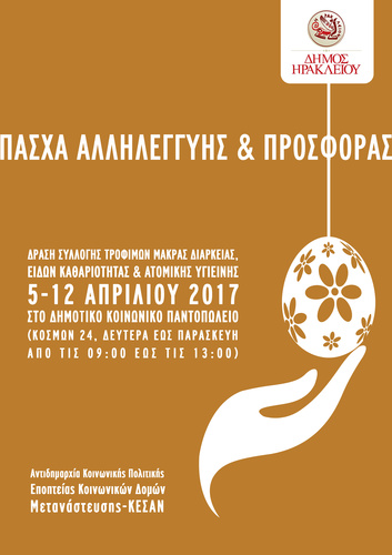 Η Αντιδημαρχία Κοινωνικής Πολιτικής του Δήμου Ηρακλείου με αφορμή τις Άγιες Ημέρες του Πάσχα διοργανώνει τη δράση "Πάσχα Αλληλεγγύης και Προσφοράς". Έτσι, ξεκινά τη συγκέντρωση τροφίμων μακράς διάρκειας, ειδών καθαριότητας και ατομικής υγιεινής στο Δημοτικό Κοινωνικό Παντοπωλείο (Κόσμων 24). Η παράδοση των προϊόντων μπορεί να γίνεται καθημερινά από Δευτέρα έως Παρασκευή και ώρες 09:00 π.μ. έως 13:00. Η δράση ξεκίνησε χθες,Τετάρτη 5 Απριλίου και θα ολοκληρωθεί Μεγάλη Τετάρτη, 12 Απριλίου 2017.